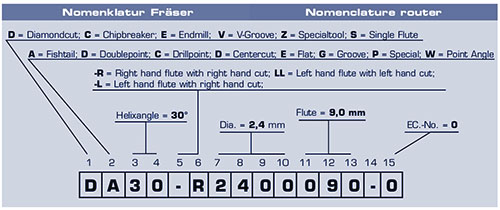 Vollhartmetallkonturenfräser mit Schaft-Ø 3,175 mm und rechtsschneidender feiner Diamantverzahnung, mit 30° Spiralwinkel, im Ø-Bereich 0,60 – 2,40 mm, hervorragend einsetzbar bei harten Leiterplattenwerkstoffen