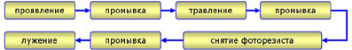 Проявка, удаление фоторезиста или лужение и струйная промывка.